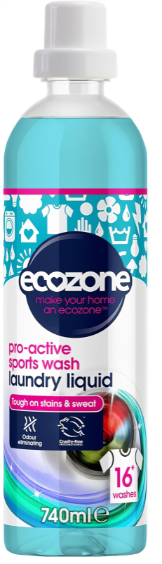 Přípravek Pro-active Sports Wash je speciálně navržen pro odstranění skvrn běžně se vyskytujících na sportovním oblečení, jakými jsou tráva, špína, hlína a krev. Obsahuje účinnou látku: zinečnatý ricinoleát, který pomáhá eliminovat zápach. Je účinný i při nízkých teplotách.